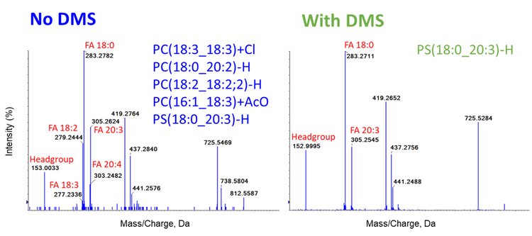 Figure 4 (right) uses the DMS cell with a COV value of 12 to isolate phosphatidylserine (PS). The spectrum utilizing the DMS shows a single lipid species of PS(18:0_20:3) at the same m/z 812.6. This provides confidence in identification and the capability to accurately quantify with the fatty acid species.