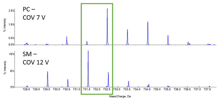 In the positive ion mode, EquiSPLASH standards were infused via syringe pump with the DMS cell on. The compensation voltage was ramped from -40 to +30 and a TOF scan was collected with the m/z range of 50-1000 Da. Phosphatidylcholine (PC) and sphingomyelin (SM) are two classes of compounds that in the positive ion mode share many M+1 isotopes and can lead to false positive identifications and possible overestimations. By finding a COV that is specific to each class, users can properly identify and quantify lipid species in each class (Figure 2). To demonstrate this separation and isobaric overlap removal, Figure 3 is a TOF spectrum that shows the potential for overlap. The top pane is a PC spectrum that was acquired with a COV value of 7 and the bottom pane was acquired with a COV value of 12. The green box highlights one example of overlap in the spectrum. At m/z 731.5 is sphingomyelin species SM(d18:1/18:1), however at 732.5 a PC(32:0) exists that would likely be lost in the isotopic spectrum of the more dominant SM lipid. By using the SelexION device, these classes are easily separated and this overlap minimized, allowing confident identification and quantification these lipids.