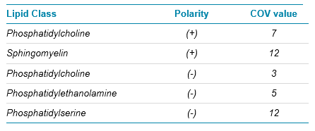 Using this workflow, users have the ability to optimize the COV value for every lipid class of interest in both the positive and negative ion mode to lower the false discovery rate of lipid species annotation without sacrificing throughput. Each lipid species method requires an average of 1.6 minutes of acquisition. The six phospholipid subclasses in the negative ion mode would take less than 10 minutes of acquisition.