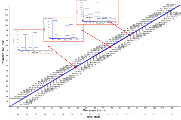 - Extraction of any precursor ion spectrum, neutral loss, and corresponding product ion spectrum, retrospectively.