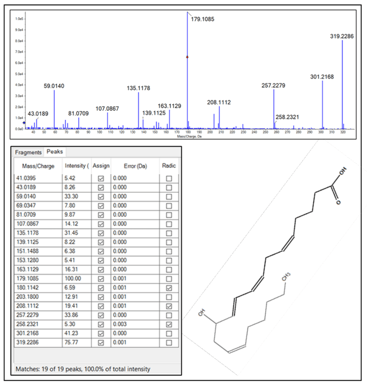 One of the benefits of analyzing lipid mediators by HRMS is the generation of a full product ion spectrum, particularly with sMRMHR analysis. This contrasts with TQMS analysis, wherein a qualitative product ion spectrum can only be acquired via a dedicated scan, which will increase the overall duty cycle of the experiment and may generate lower-quality data. Figure 2 (top panel) shows the CIDbased product ion spectrum acquired for 12-HETE during sMRMHR analysis. Within the Explorer module of SCIEX OS software, the fragment pane (bottom, left) can be linked to the acquired MS/MS data and assign peaks from an in silico-generated fragment. This, in turn, can be linked to a .mol file (bottom, right) where the fragments can be highlighted in bold on the structure. This capability enables analyte confirmation and provides multiple fragments from which the analyte can be quantitated.