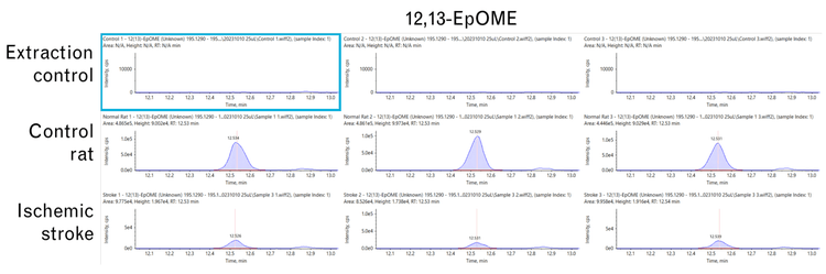 Extraction controls show no 12,13-EpOME, and its levels decrease upon ischemic stroke.