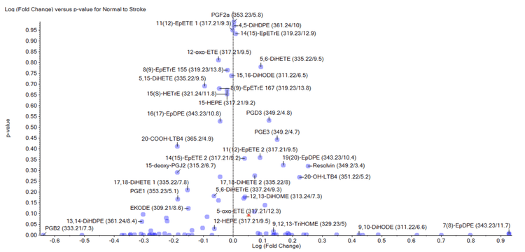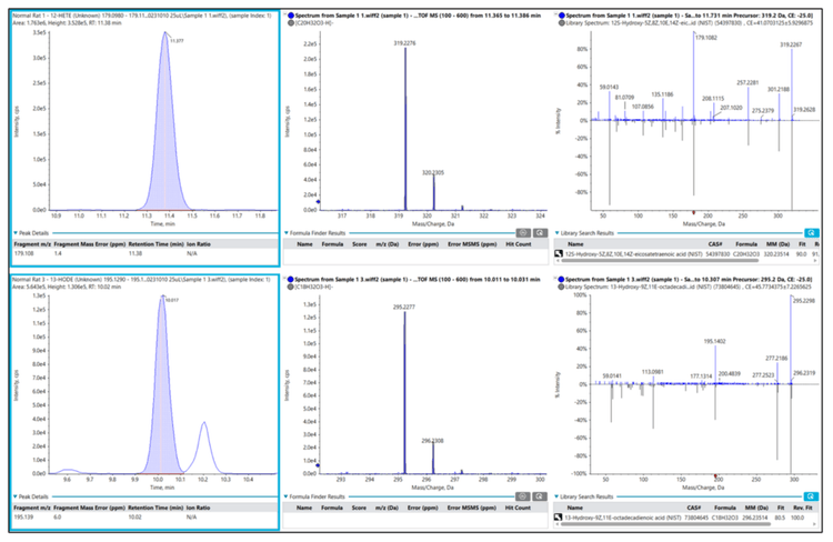 This study leveraged the ZenoTOF 7600 system's sensitivity and versatility to quantify lipid mediators in rat plasma. The full product ion spectra acquired during quantitative analysis were used to verify the lipids’ identities by matching them to a NIST library database with LibraryView software. The biological importance of these results was highlighted using MarkerView software to determine the changes in lipid mediator abundance due to ischemic stroke in rats.
