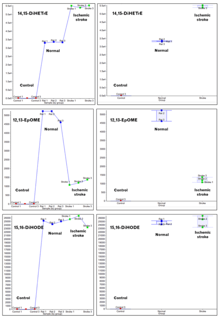 The relative concentration changes in lipid mediators among the different sample types can be assessed from the data using MarkerView software, a module within SCIEX OS software. Figure 4 shows three sets of panels (top, middle, and bottom) that highlight the changes in the concentrations of 14,15-DiHETrE, 12,13-EpOME, and 15,16-DiHODE resulting from ischemic stroke, respectively. 14,15-DiHETrE concentrations rise significantly, as shown by the triplicate data points in the top left panel and the averaged data in the box and whisker plots in the top right panel. Similar data is shown for the other two lipid mediators, except that the concentration of 12,13-EpOME decreases upon ischemic stroke, and the 15,16-DiHODE concentrations remain the same. The extraction control samples demonstrate there is interference associated with the sample preparation.