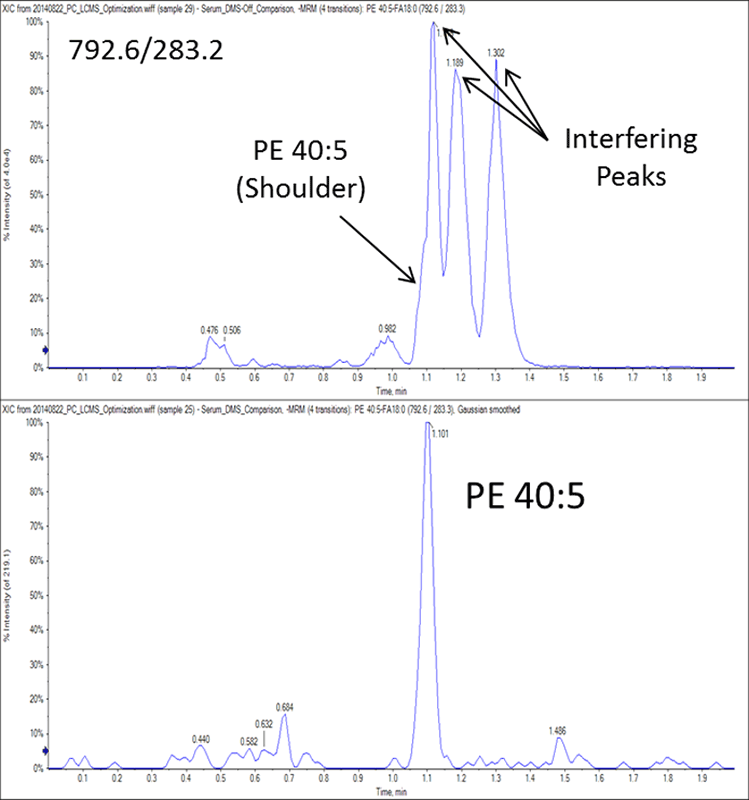 In addition to isobaric overlap, complex lipids have many of the same fragment ions due to there only being a discrete number of fatty acid species acylated to the lipid glycerol backbone. As a consequence, different lipid molecular species can have the same MRM transition, which leads to interfering peaks in the LC-MRM chromatogram and can cause significant problems in quantitation. The increasing demand for high throughput analysis with ultra-high-performance liquid chromatography (UHPLC) precludes the extended chromatographic run times needed to separate critical molecules.
