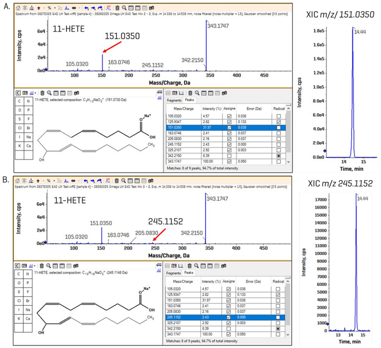 shows similar data for 11-HETE. Two fragments were identified that are unique from those generated by 11,12-EET using EAD-based fragmentation. In (A), the base fragment peak at m/z 151.0350 has a potential structure that distinguishes it from 11,12-EET; however, this fragment is common to any delta-5 fatty acid (e.g., arachidonic and eicosapentaenoic acids), so there would likely be background interference in a biological matrix. In (B), a fragment at m/z 245.1152 is identified that is more specific to the structure of 11-HETE. The XIC for both fragments shows a clean chromatographic peak at the correct retention time of 14.44 min. It is important to note that these studies employed primary reference standards diluted with solvent; therefore, matrix effects were not addressed, and the resulting data may be more challenging to interpret.