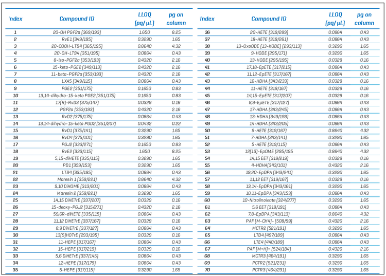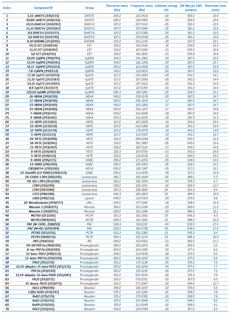 https://doi.org/10.1021/jasms.2c00256 - Comprehensive targeted method for lipid mediator analysis. SCIEX technical note RUO-MKT-02-12096-A: https://sciex.com/content/dam/SCIEX/pdf/tech-notes/all/targeted-method-for-lipid-mediators.pdf