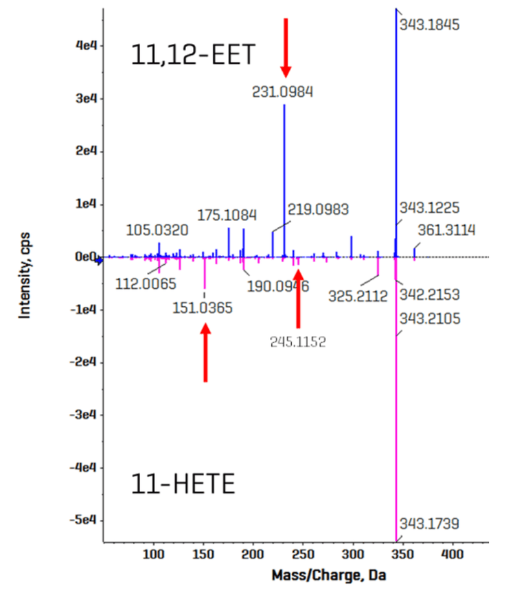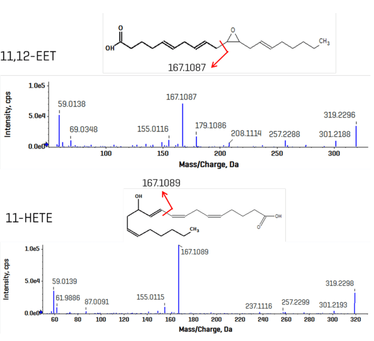 Figure 3 shows the CID-based fragmentation product ion spectra for 11-hydroxyeicosatetraenoic acid (11-HETE) and 11,12-epoxyeicosatrienoic acid (11,12-EET). These isomers have the same fragmentation pattern, with no significantly distinctive MS/MS features