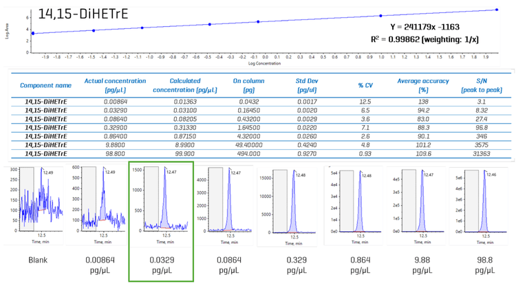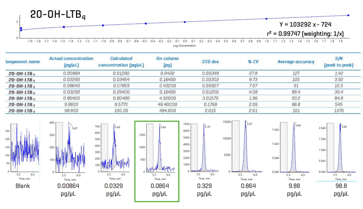 The oxylipin standards were analyzed in the negative and positive ion modes, depending on the compound (Table 1). Figure 1 shows the analytical results for 20-OH-LTB4. The LOQ was determined to be 0.0329 pg/µL, corresponding to 0.1645 pg on column with a 5 µL injection volume; the signal to noise (S/N) average for the LOQ of 20-OH-LTB4 was 37, which means the true LOQ may be lower than that noted here. Example XIC chromatograms are shown for the blank and each standard concentration injected, which show good peak shape and minimal background interference. The latter is an important consideration even with standards prepared in neat solvent. Many solvent brands have significant chemical background contamination that appears during negative ion mode analysis at masses < 500 Da. In these experiments, solvents were purchased from Burdick and Jackson (also sold under the Honeywell brand), which have the lowest background contamination levels among the different solvent brands we have tried.