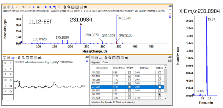 Figure 5 shows the user interface in the Explore module of SCIEX OS 4.0 software (left). The product ion spectrum for 11,12-EET appears in the top panel, and the fragment m/z 231.0984 is highlighted. This fragment does not appear in the spectrum for 11-HETE. Using a .mol file with the Fragment Pane tool within the Explore module in SCIEX OS software, a potential structure for the fragment is identified in bold, which has a mass error of 0.001 Da. An XIC of the fragment is shown on the right, which displays a predominant peak at 15.57 min, corresponding to the retention time of 11.12-EET (based on CID-based qualitative data to determine retention times of analytes). Figure 6