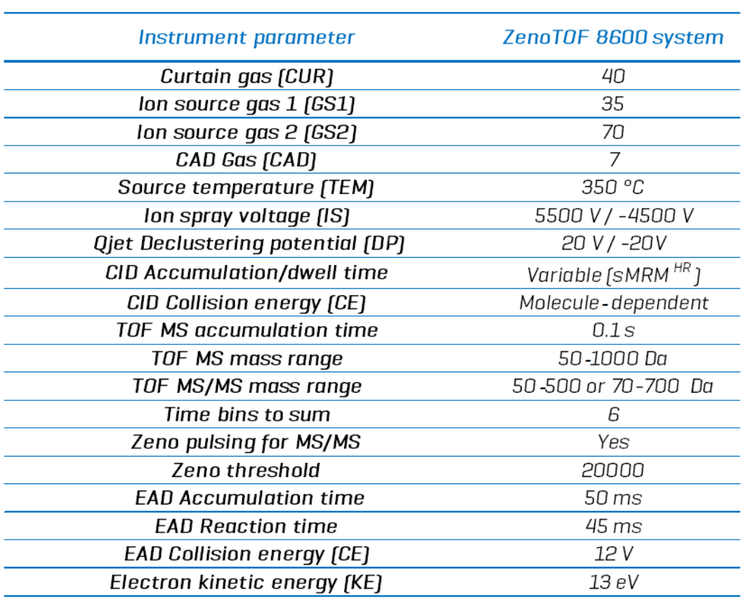 Mass spectrometry: Sample extracts were analyzed using the ZenoTOF 8600 system with an OptiFlow Pro ion source and a scheduled, high-resolution multiple reaction monitoring (sMRMHR) scan mode. CID-based fragmentation was used for the quantitative analysis of oxylipin standard curves, and EAD was used for enhanced analyte structural characterization. Compound parameters are presented in Table 1, and MS instrument parameters are presented in Table 3.