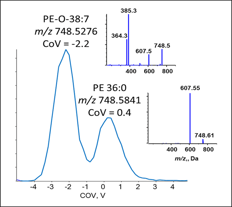 Ether-linked and diacyl-linked phospholipids are near isobars; therefore it is necessary to resolve ether-linked and diacyl-linked phospholipid molecular species to adequately characterize their molecular species compositions. Chromatographic separation is a possibility, but due to the diversity of molecular species within a phospholipid class, this approach is not practical for profiling experiments. Even with high resolution MS, product ion analysis depends on a low-resolution isolation step that would generate a non-specific, convoluted MS/MS spectrum from the nearly isobaric compounds.