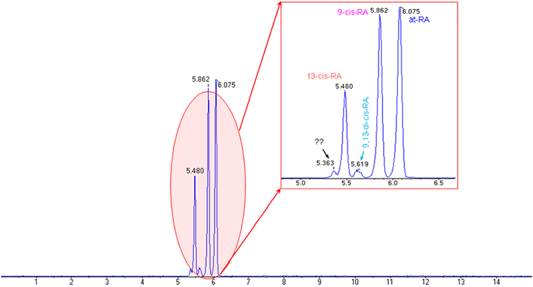 The three main chromatographic peaks represent the three targeted retinoic acid isomers: 13cis-RA at 5.48 min, 9cis-RA at 5.86 min and at-RA at 6.08 min. Two other minor isomers were also separated: 9,13-di-cis-RA at 5.62 min and a possible unidentified isomer at 5.36 min.