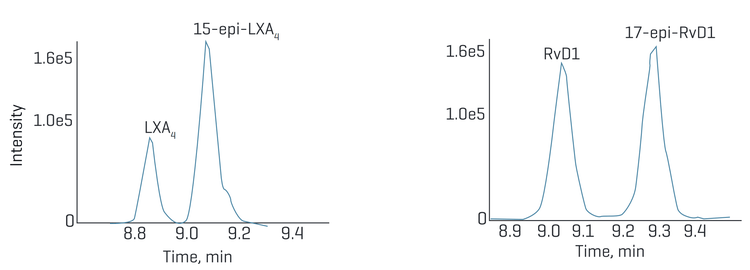 Figure 6 shows the complete baseline separation of proresolving lipid mediator epimers. Baseline separation of LXA4 and 15-epi-LXA4 (top panel) as well as RvD1 and 17-epi-RvD1 (bottom panel) enables the differentiation of enzymatic pathway utilization for pro-resolving lipid mediator production. Specifically, LXA4 and RvD1 are produced by 5- and 15-lipoxygenase pathways, and 15-epi-LXA4 and 17-epi-RvD1 are produced by 5-lipoxygenase and acetylated cyclooxygenase-2 pathways. Thus, separation, identification, and quantitation of these species can reveal important biological insights into the mechanisms of inflammatory processes governing various biological observations (Figure 1)