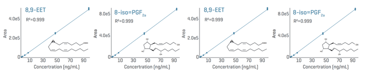 Concentration curves were generated by injecting 3 replicate injections of 8 different concentrations of each lipid mediator standard. Excellent linearity is observed with r2 of 0.999 obtained for the representative concentration curves for selected resolvins, prostaglandins, EETs, and non-enzymatic isoprostanes as shown in Figure 5.