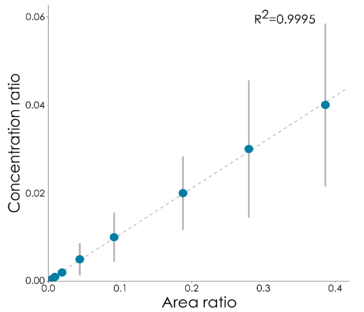 A series of eight different calibration standards was prepared in LC-MS grade water (Biosolve) with a glucose concentration ranging between 0 and 0.4% (w/v) and a 13C-glucose concentration of 0.1% (w/v) per standard (Figure 2). Area ratios were calculated by dividing the area of the glucose quantifier by the area of the 13C glucose quantifier. These ratios were then plotted against the concentration ratios of each sample, calculated as the percentage of glucose (%w/v) divided by the percentage of 13C glucose (% w/v) in the respective standard. The calibration curve, measured over six replicate injections per standard, was linear over the reported concentration range (r² = 0.9995) and was used for interpolating sample data.