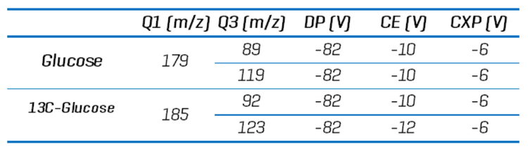 The spray voltage was set to -4000V, and the source temperature was 350°C. Ion source gas 1 was 90 psi, gas 2 was 70 psi, and the curtain gas was 30 psi. Table 1 lists MRM transitions and compound-specific parameters used for the glucose method, such as collision energy (CE), declustering potential (DP), and cell exit potential (CXP).