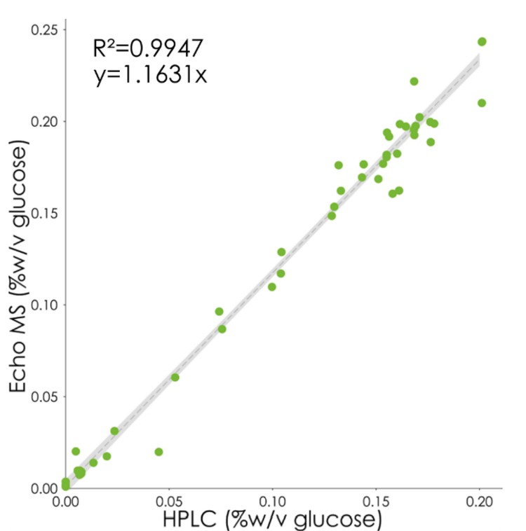 - A direct comparison of glucose measurements obtained using the Echo® MS system or HPLC-IR showed similar quantitative performance