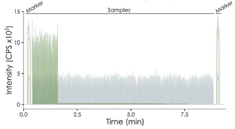Mass spectrometry: Data were acquired using an Echo® MS module with the SCIEX Triple Quad 6500+ system in MRM scan mode, which simultaneously measured 4 transitions in negative ion mode: 2 for glucose and 2 for 13C-glucose. The deprotonated molecular ion [M-H]- for each compound was selected in Q1 and subsequently fragmented in the collision cell. In Q3, the quantifier ions at m/z 89.0 and 92, and the qualifier ions at m/z 119.0 and 123.0were analyzed for glucose and 13C-glucose, respectively.