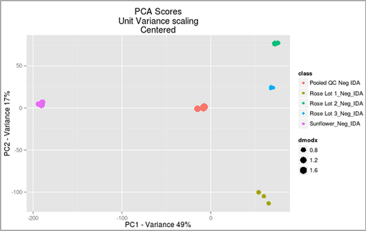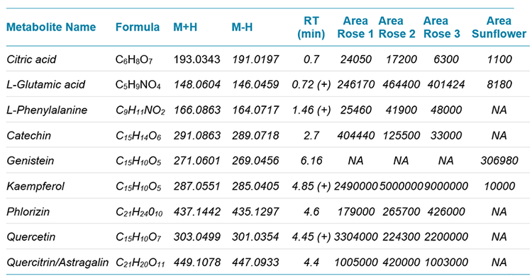 Sample preparation: Extractions of rose petals from 3 different lots and an extraction of sunflower leaves were provided by University of Hohenheim, Stuttgart, Germany. An aliquot of all extracts was also combined into another “pooled” lot to serve as a quality control. The five different sample groups (3 x rose, 1 x sunflower and a pooled QC) were then injected in triplicate for analysis.