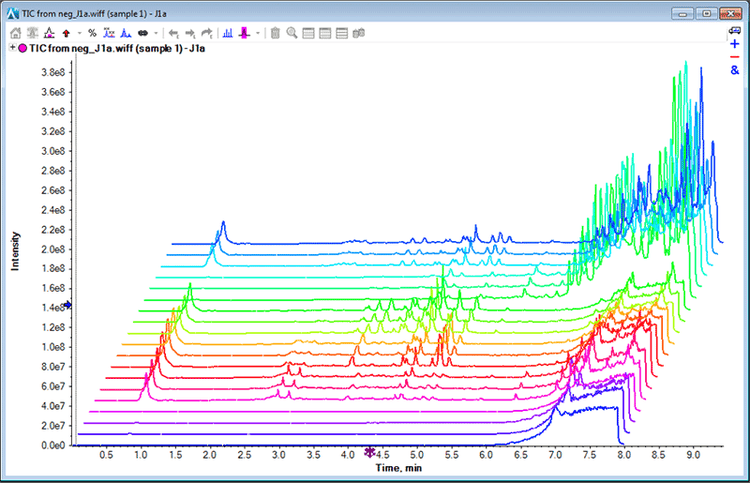 The data files were opened in SCIEX OS Software or PeakView® Software and the chromatograms examined for reproducibility and integrity, injection to injection (Figure 2). This is always good practice to QC the data this way before starting to process it to identify any issues encountered during sample collection.