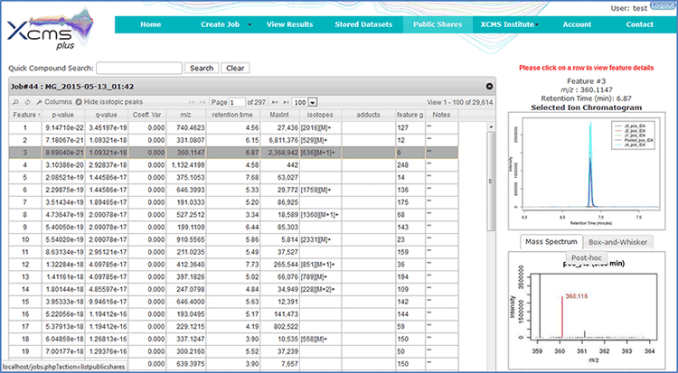 The XCMSPlus feature table lists all of the differentiating features by p-values and or q-value (FDR adjusted p value). Clicking on any row in the feature table of the software, extracts the ion chromatogram on the right hand side (Figure 4). Results can be explored in detail using the interactive features.