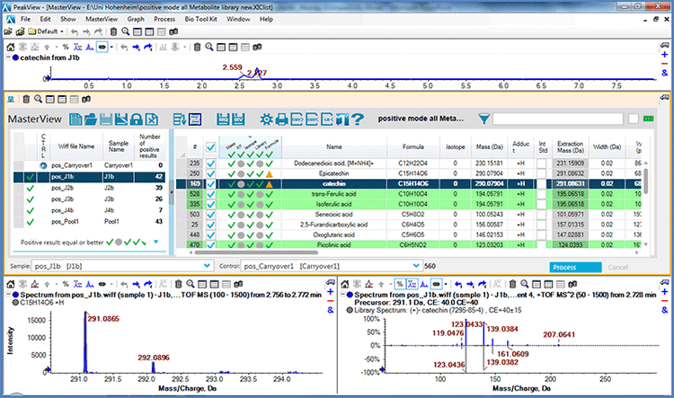 Confirmation by MS/MS means higher confidence in the assigned metabolite. The top pane in Figure 5 shows the XIC of the highlighted row for Catechin. The center pane contains the report information and formulas, the bottom two panes show the library matches of MS and MS/MS spectra. Relative quantitative amounts of the compounds from the target list were easily reviewed and summarized. Table 1 shows that the rose extracts had high levels of Kaempferol, Quercetin, Catechin, Glutamic acid and L- Phenylalanine. Phlorizin (a flavonoid known to be present in apple and cherry), was used as an internal standard and was spiked into the rose leaf extracts at different concentrations. No Phlorizin was added to the sunflower extract; therefore it was not identified in this sample. Sunflower extracts showed high levels of Genistein in positive mode compared to lower levels in the rose extracts. The presence and relative amounts of several endogenous organic acids are also shown in Figure 5.