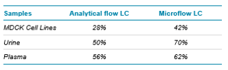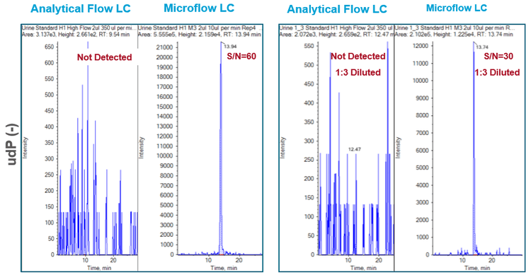 The microflow HILIC LC-MRM method improved the S/N ratio by up to 60X with an average improvement of 10X (Figure 4). This improved sensitivity resulted in higher number of metabolite detection with a 50% improvement in MDCK cell line, 35% in urine and 11% in plasma when compared to analytical HILIC LC-MRM (Table 3).