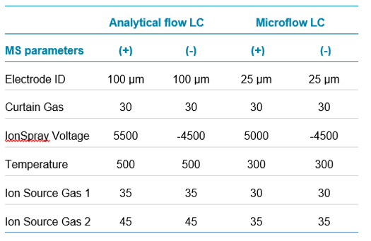 Mass spectrometry: A SCIEX QTRAP 6500+ System with IonDrive Turbo V Source was used. For the microflow LC experiments, the standard 100 µm electrode was replaced with a 25 µm ID electrode (SCIEX). MS source parameters were optimized for analytical and microflow (Table 2). A total of 187 positive ion mode MRM’s and 176 negative ion mode MRM’s for a total 312 unique polar metabolites were combined into a single +/- switching experiment (363 total MRM transitions) with 3 msec dwell time and 50 msec settling time for polarity switching to monitor these endogenous metabolites across different metabolic pathways.