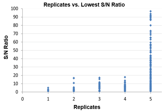 The S/N ratio for all detected metabolites using this MRM method with both analytical flow LC and microflow LC were compared. For each detected metabolite in urine, the lowest observed S/N (calculated by MultiQuant Software) was plotted versus the number of replicates that the metabolite was detected in (Figure 3). 197 metabolites that were detected with S/N ≥20 are seen in all 5 replicates, and therefore considered to be detectable with high confidence without requiring further manual validation. 22 of the metabolites detected with a lowest S/N of 10-20, were manually validated. All of these were detected in all 5 replicates with a manually determined S/N of at least 5.