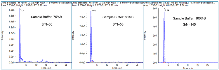 MultiQuant software integrated peaks for the urine metabolites were compared where the metabolite pellet was reconstituted either in 75, 85 or 100% mobile phase B. The metabolite pellet dissolved in 100% B (the LC method starting buffer) shows improved sensitivity and S/N ratio for targeted polar metabolites (Figure 2).