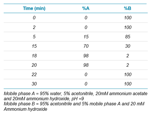 Microflow flow chromatography: A SCIEX M5 MicroLC System was used in direct injection mode. A Luna 3 µm NH2 100 Å, 150 x 0.3 mm analytical column (Phenomenex) was used with a micro filter 1 µm SS (Upchurch Scientific) before the column to prolong column life time. Flow rate of 10 µL/min was used. The column temperature was set to 40°C. Injection volume was 2 µL, and the autosampler needle and valve wash consisted of 1 cycle using mobile phase A, followed by two cycles using mobile phase B. The gradient used is described in Table 1.