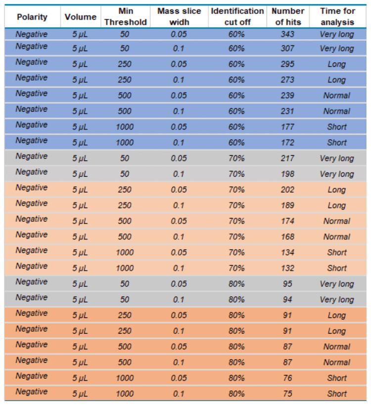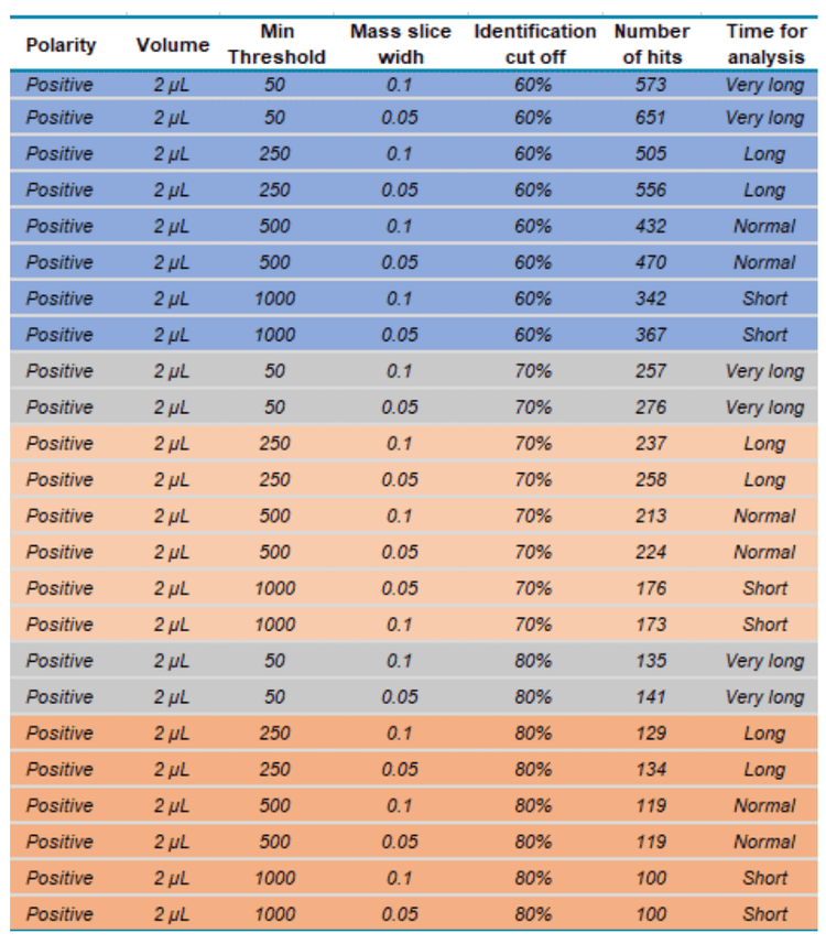 Each row in Tables 3 and 4 is color-coded according to their identification confidence. Dark orange and light orange coded rows denote high confidence, while blue coded rows denote lower confidence and may contain more false positive results. Grey-coded rows represent little increase in the number of hits but indicate significantly increased analysis time. For context, the time for analysis of a single sample is presented in Table 5. Changes in the “Min Threshold” parameter can dramatically affect the analysis time but have less affect the number of hits. The identification cut-off percentage has a significant impact on the number of hits. And the “mass slice width” affects the number of hits only for data with low confidence.