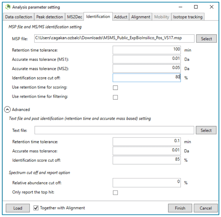 In the identification section, an MSP file, which can be downloaded from MS-DIAL’s website, should be selected, and the identification cut-off value should be set. The default value for this parameter is 80%, but in this study, values of 70% and 60% were also used to observe the effect on the final results. The remaining parameter settings can be set as shown in Figure 5. If a custom library is to be used, click on the advanced button and select the library. (The library should be stored as a *.txt file.)