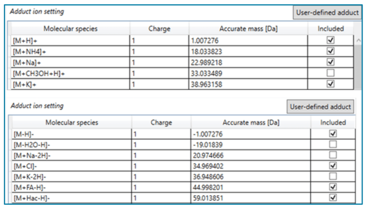 Metabolite adducts can vary depending on the modifiers added to solvents. For example, in the positive ion mode, a compound can appear as a protonated ion or as a sodium, potassium, or ammonium adduct. The recommended adducts to be selected in both positive and negative ion modes are presented in Figure 6.