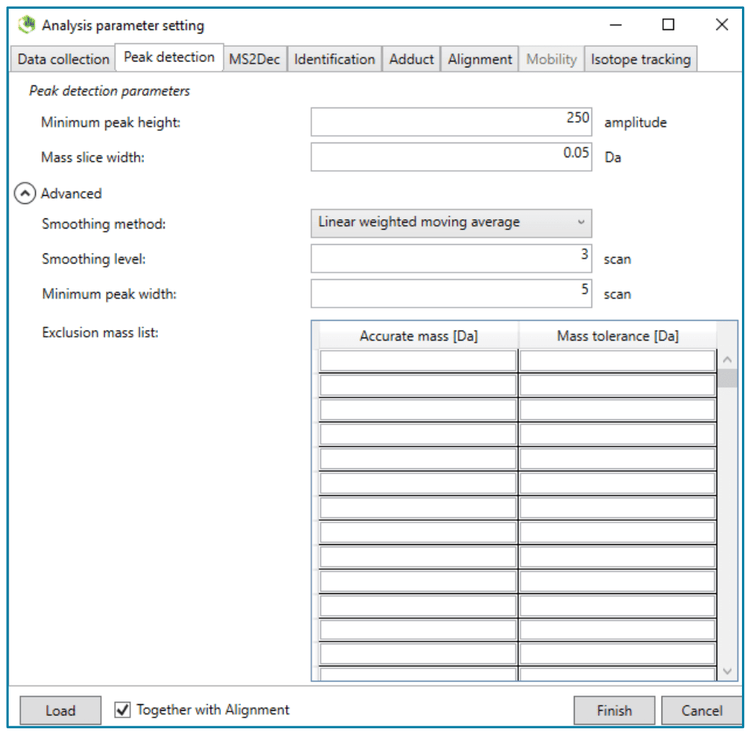 Under the “Peak detection” tab, there are two parameters to be adjusted for optimal peak detection: “Minimum peak height” and “Mass slice width” (Figure 4). One of the goals of this technical note was to investigate how varying these parameters affects the data quality and the overall processing time. For “minimum peak height,” 50, 250, 500, and 1000 amplitude were sequentially selected, and the mass slice was set to 0.05 or 0.1 Da. If the smoothing method needs to be changed, click Advanced in this section for detailed smoothing settings.