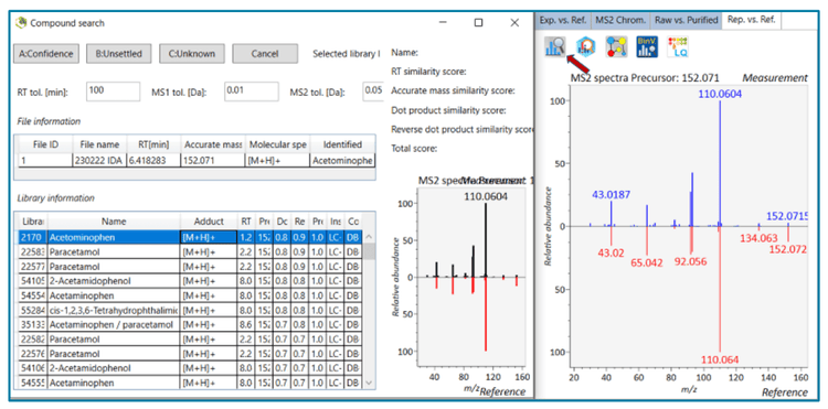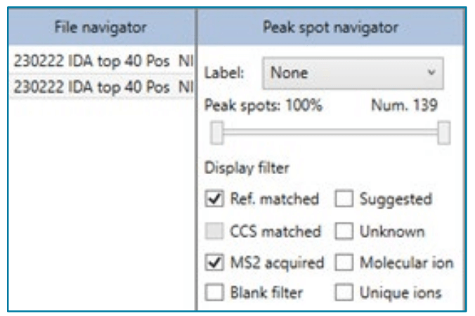 The confidence level in the processed data can be adjusted in the “Peak spot navigator.” Clicking on the “Ref. matched” display option will only show compounds with a matching MS/MS reference spectrum in the compound library (Figure 8).