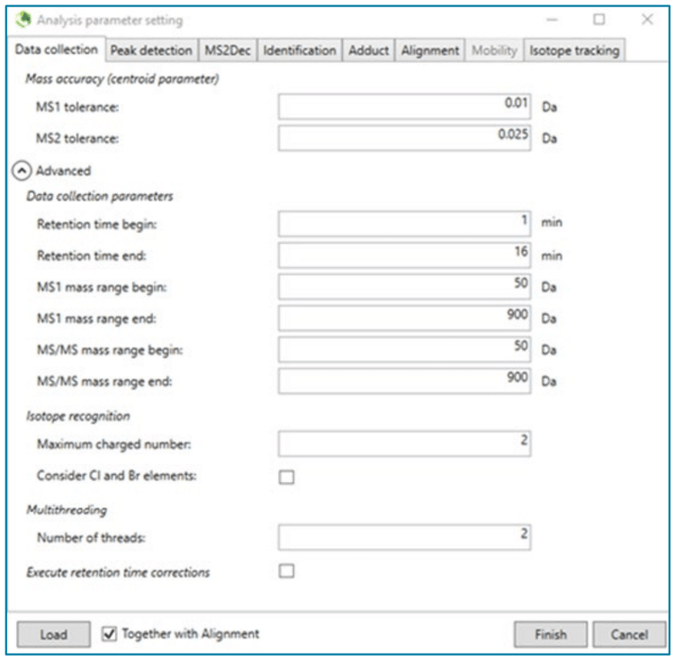In this section, MS-DIAL software parameter settings critically affect coverage and the time needed to process the data files. Significantly, these settings also affect the number of false positive results. In the “Mass accuracy” settings, the default values are recommended. Next, click the “advanced” button, as shown in Figure 3. To limit the data processing mass range and potentially reduce the time required for processing, enter the appropriate MS1 and MS2 mass ranges. It is also recommended to define when retention time starts and ends to remove unnecessary data points, such as the washing step, from the analysis. The other settings can be kept as default values. If a powerful workstation computer is used, the “Number of threads” setting can be set to more than 2.