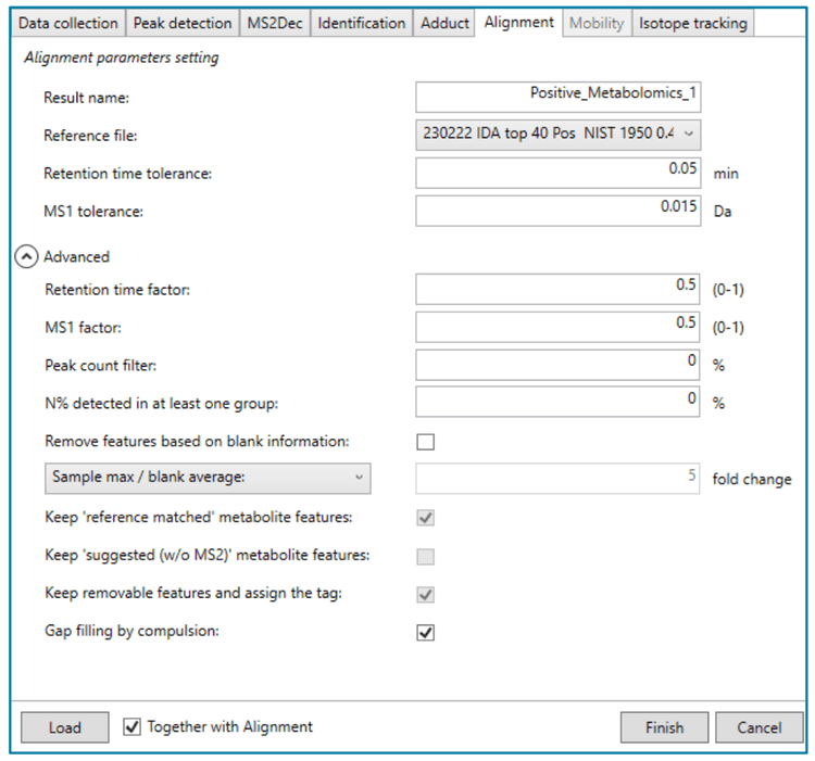 This is the final section to be completed before processing a sample or a sample batch (Figure 7). A reference sample file should be chosen from a pooled QC sample or from the sample with the highest metabolite concentration. The remaining parameters (and those under the Advanced tab) were set to the default values since they are compatible with the ZenoTOF 7600 system data acquisition. Once all parameters have been set, click “Finish” and wait until the results screen appears.