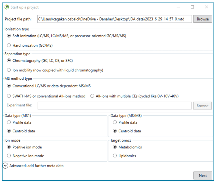 Initial “new project” creation is illustrated in Figure 2. Selecting the project file path where the raw files are stored is critical. WIFF and WIFF2 files can be submitted to MS-DIAL without conversion. Click “Soft ionization,” “Chromatography,” and “Conventional LC/MS or dependent MS/MS” for the first three tabs. Other noteworthy options to consider are “Data type” (MS1 and MS2). Choose “Centroid data” for both sections. Lastly, select “Metabolomics” for the target omics and “negative” or “positive” for the ion mode.