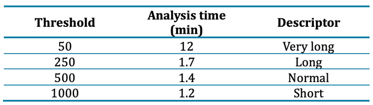 - For extensive cohort studies, or in situations where it is necessary to minimize the overall analysis time, the “Minimum threshold” parameter setting value can be increased up to 1000 cps