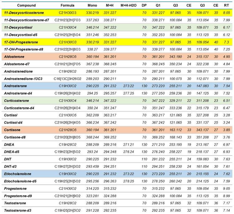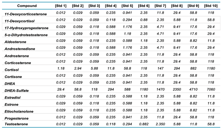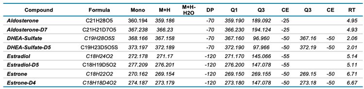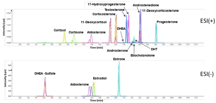 Hormonal steroids regulate most body functions and the dysregulation of these molecules can play a role in the pathophysiology of human disease. Early techniques to measure endogenous steroids include immunoassay and gas chromatography-mass spectrometry (GC-MS). Immunoassays are problematic because they lack specificity for low-level steroids due to interference from endogenous steroids present at higher levels. In contrast, GC-MS offers higher specificity and is sensitive to low-level steroids, however, it requires extensive sample preparation via derivatization. More recently, steroid analysis by liquid chromatography-tandem mass spectrometry (LC-MS/MS) has emerged as a sensitive and specific technique with a simplified sample preparation.