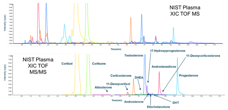 Sample preparation: Stock solutions of analytes and internal standards were diluted in PBS to generate standard curves using technical replicates to determine the LOD and LLOQ of steroids (Table 1). PBS was used as a matrix surrogate because plasma contains significant amounts of endogenous steroids. Deuterated internal standards were added to NIST 1950 plasma samples at a final concentration of 1 ng/mL to quantify endogenous steroids. For plasma samples and quality control (QC) samples, 5 µL of the internal standard mixture was added to 200 µL of sample with and 300 µL DI water. Samples were shaken @ 700 rpm for 5 minutes, and the protein was precipitated by adding 250 µL of 0.1M zinc sulfate and shaking @ 600 rpm for 5 minutes after which 500 µL cold methanol was added. Samples were again shaken at 500 rpm for 5 minutes, centrifuged at 2637 rcf for 10 minutes at room temperature, and the supernatant was collected and loaded onto a preconditioned HLB SPE 30mg (30 µm) plate. The plate was washed with DI water and steroids were eluted with acetonitrile. The eluant was dried with N2, and samples were reconstituted in 50 µL 50:50 methanol:water. The samples were then analyzed by LC-MS/MS using the ZenoTOF 7600 system.