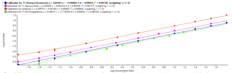 Linear regression curves were generated for each steroid (Figure 2) and a linear dynamic range (LDR) > 5-orders of magnitude was observed. The generated standard curves were within the LDR, as exemplified by simultaneous runs of the standard curves for 11-deoxycortisol and cortisol. The standard curve for 11-deoxycortisol included concentrations as low as 0.012 ng/mL, whereas the standard curve for cortisol included concentrations as high as 1180 ng/mL. This large difference in concentrations spans a LDR of 5 orders of magnitude, from -2 to +3 log concentration ratios (data not shown).