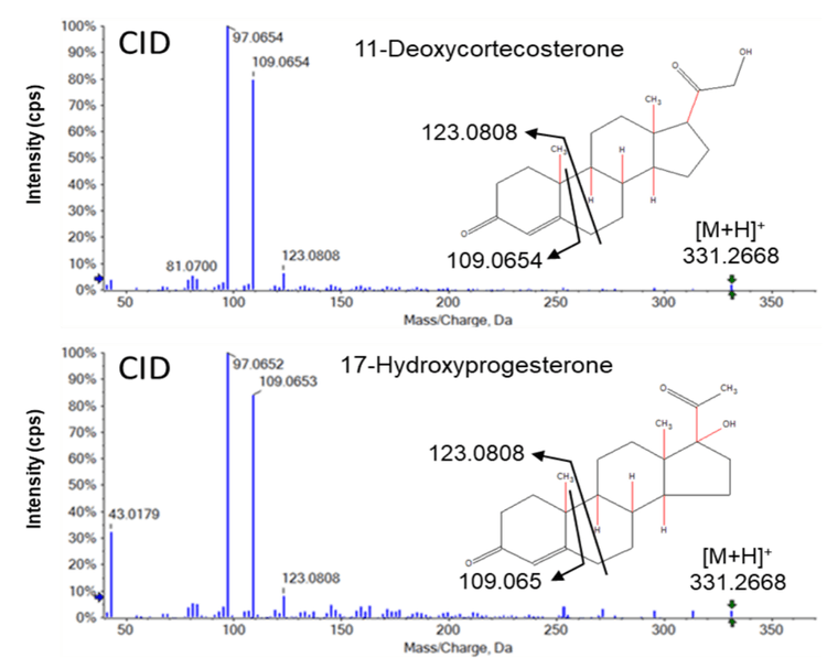 EAD fragmentation can be used to distinguish between molecules that appear identical with CID fragmentation. Figure 4 shows the identical CID product ion spectra for the isomers 11- deoxycorticosterone and 17-hydroxyprogesterone, which both have masses of m/z 331.227 (Table 3, highlighted in yellow). MRM transitions are not sufficient to distinguish between the CID-based spectra of these molecules. Therefore, the isomers must first be chromatographically separated by HPLC.