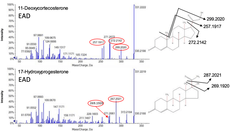 Figure 5 (top) shows 3 unique EAD-based fragments derived from 11-deoxycorticosterone that were not present in the spectrum for 17-hydroxyprogesterone (Figure 5, bottom). Similarly, 2 unique fragments were found for 17-hydroxyprogesterone. These product ions can be used in sMRMHR experiments using EAD-based fragmentation to increase the specificity of the assay by distinguishing between these 2 isomers.
