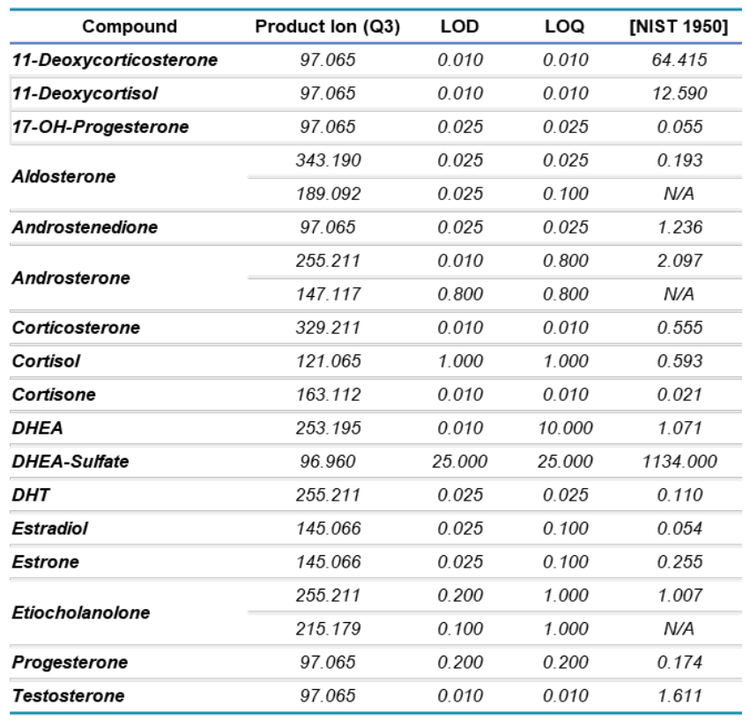 - The LLOQs calculated for all measured steroids by HRMS were sufficient to accurately measure steroids in plasma