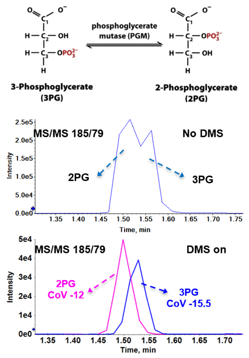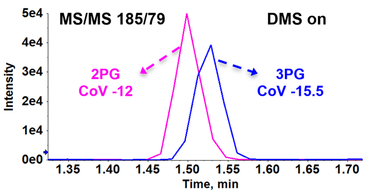 When DMS was used to separate 3PG and 2PG, a separation voltage of 2000V was used. The compensation voltages were tuned for both 2PG and 3PG and were found to have quite different CoVs, -12 and -15.5, respectively (Figure 5, bottom). This allows complete separation of the two metabolites with DMS for accurate quantification with minimal overlap.
