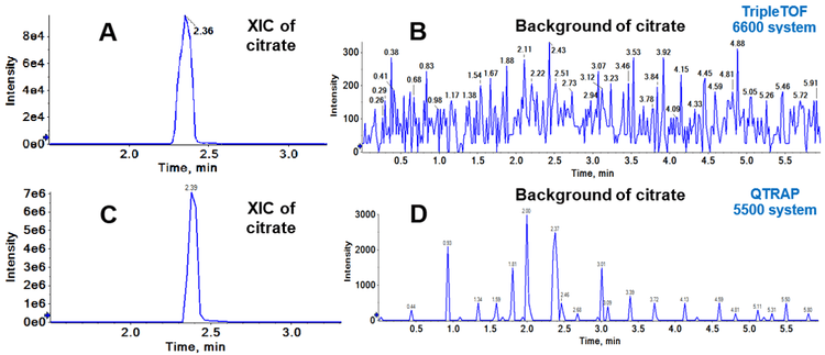 Figure 4.  Comparison background and peaks for quantitation. (A) Extracted ion chromatogram (XIC) of fragment ion 111 from full scan MS/MS of citrate (m/z 191) from the TripleTOF 6600 System. (B) Background observed in the MS/MS for the citrate precursor for the TripleTOF 6600 System. (C) MRM data of citrate 191/111 from the QTRAP 5500 System. (D) Background observed at the citrate MRM transitions for the QTRAP 5500 System.