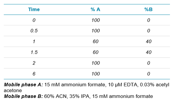 Chromatography: Separation was performed using an ExionLC™ system and a Thermo Scientific Hypercarb Carbon column (100x4.6 mm, 3 µm). Flow rate was 1 mL/min with a linear gradient as outlined in Table 1.